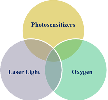 光動力療法是用於某些表淺癌症的消融療法,他的作用原理是結合光敏劑和發射特定雷射波長的光源系統,如Diomed630主機能發射630奈米波長的光線。當兩者一起作用時,累積在腫瘤組織內的光敏劑會被雷射光活化,在含氧環境中殺死癌細胞。 所以施行步驟首先要給予光敏劑(口服、靜脈注射、或局部塗抹),光敏劑具有會局部滯留於腫瘤組織內的特性,腫瘤內濃度會比正常組織高許多。醫生再以特定波長的光照射腫瘤處以激發光敏劑,透過氧分子的參與 及伴隨的光化學反應,產生對細胞有毒性的單態氧,自由基(free radicals),產生細胞毒性作用,進而導致癌細胞受損乃至死亡。光動力治療除了產生單態氧和自由基直接殺傷 病變細胞,亦可能引發毛細血管內皮損傷和血管栓塞造成局部微循環障礙,進一步導致病變組織的缺血性壞 死。此外,近年來研究顯示光動力治療亦可能活化免疫系統導致細胞毒殺作用。 可見光動力療法有三個主角,光敏劑(photosensitizer),氧分子(oxygen),以及光源(Laser Light)。光敏劑本身並無毒性,若以特定波長的光照射,會激發光敏劑產生有毒性的單態氧,此時才能選擇性殺癌 細胞。 光動力治療能夠選擇性殺滅癌細胞而對正常組織 胞傷害較小的原因主要是基於特定病變組織能滯留較多的光敏劑,等於是用光敏劑將癌組織及細胞標示出來, 然後再用特定波長的光照射,產生對細胞有毒性的單態氧,而單態氧能滲透的距離很短(只有20 nm),且存在的時間很短(40 nsec),所以只能作用在光敏劑所在的細胞,不會傷害光敏劑含量低的正常細胞。