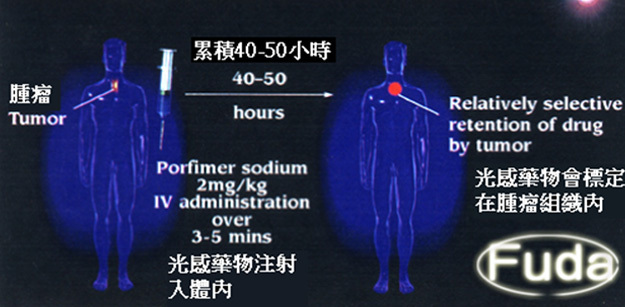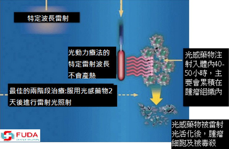 第一階段為靜脈注射光感藥物:藥物會標定累積在腫瘤細胞內,在一般組織內平均40-72小時內會被代謝掉,但在腫瘤、皮膚和網狀內皮系統內會存留較久。